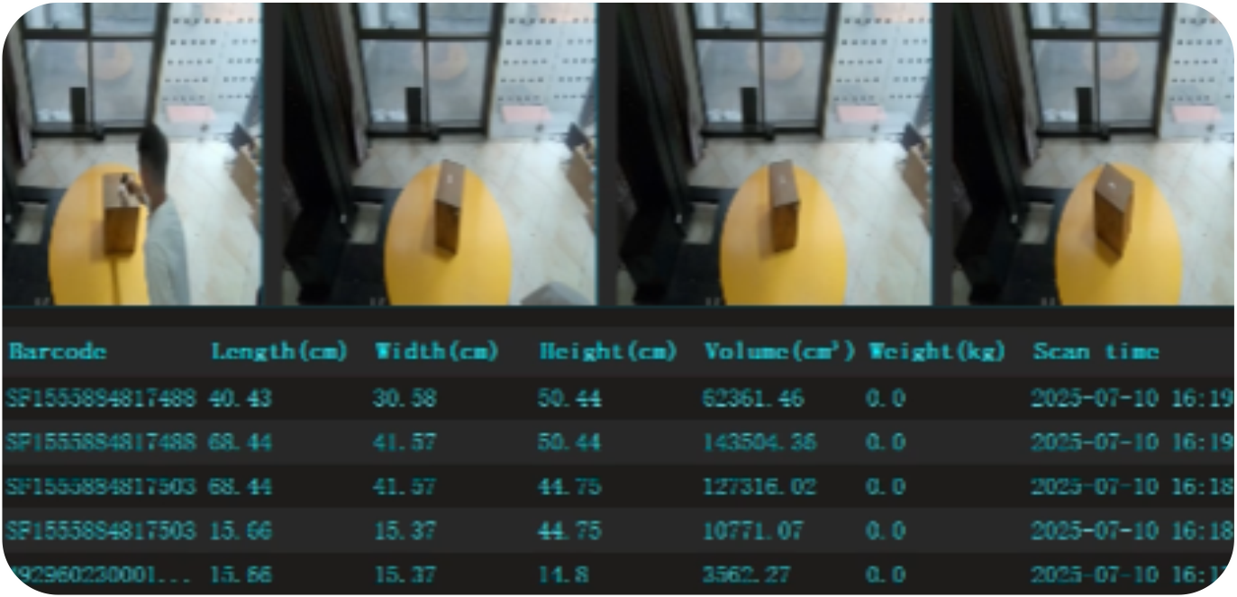 The first 3D Laser DWS Machine in China equipped with a rotating pallet algorithm, designed for precise volume measurement of single or full-pallet parcels in logistics, warehousing, and e-commerce delivery operations.