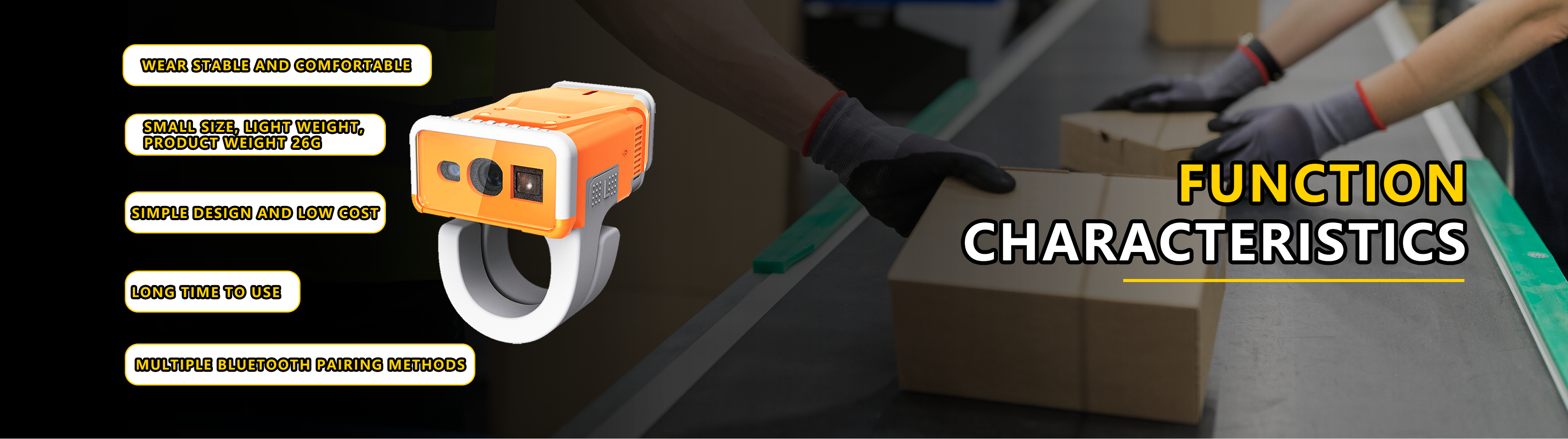 It is equipped with sound, vibration and LED prompts, battery level indicator, Bluetooth low-power design and NFC pairing capabilities. Standby time can be up to 6 months. It is a rugged ring scanning device.